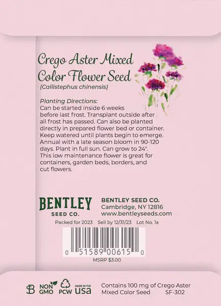 With pretty blooms that our pollinators love, these lovely flowers are named after the Greek word for “star”. Symbolizing wisdom, faith, love and color, our beautifully illustrated seed packets are the perfect way to say “Thank You” to everyone you appreciate. A garden classic! This colorful mix of shaggy, bright blooms will bring delight to your home! Late season aster flower colors! Can be started inside 6 weeks before last frost. Transplant outside after all frost has passed. Can also be planted directly in prepared flower bed or container. Keep watered until plants begin to emerge. ASTER CREGO MIX SEED INFORMATION: Lifecycle: annual Time to Maturity: 90-120 days Sun Requirement: sun Depth: surface 55-60 Seeds Per Packet Bloom Season: summer Height: 24" Uses: containers, garden beds, borders, cut flowers Low Maintenance : yes Sowing Method: Transplant or direct sow