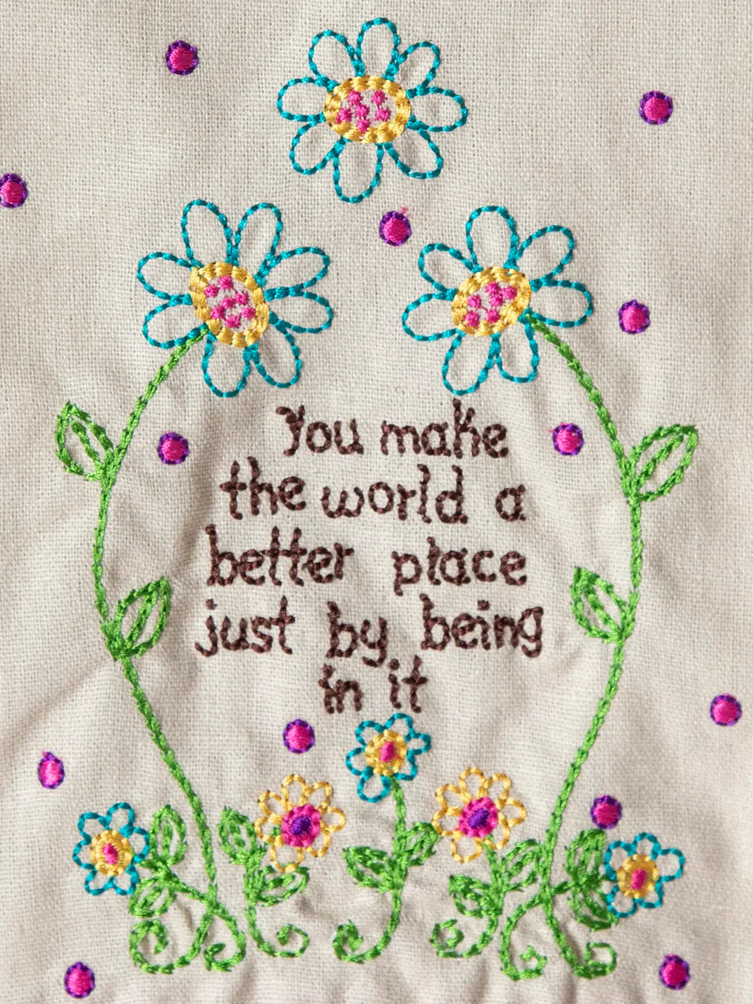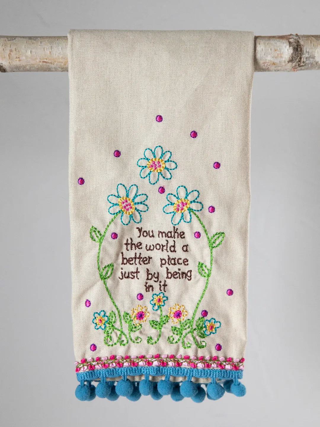 Add a charming touch to your home with the Natural Life Better Place Embroidered Hand Towel. Featuring adorable embroidery, pom pom trim, and ricrac ribbon, it brightens any powder room or kitchen. Crafted from a soft blend of linen and cotton, this towel combines style with gentle care—hand wash recommended...